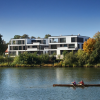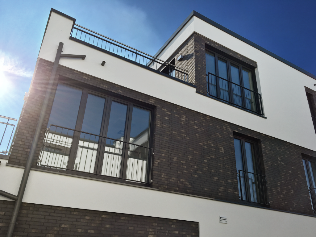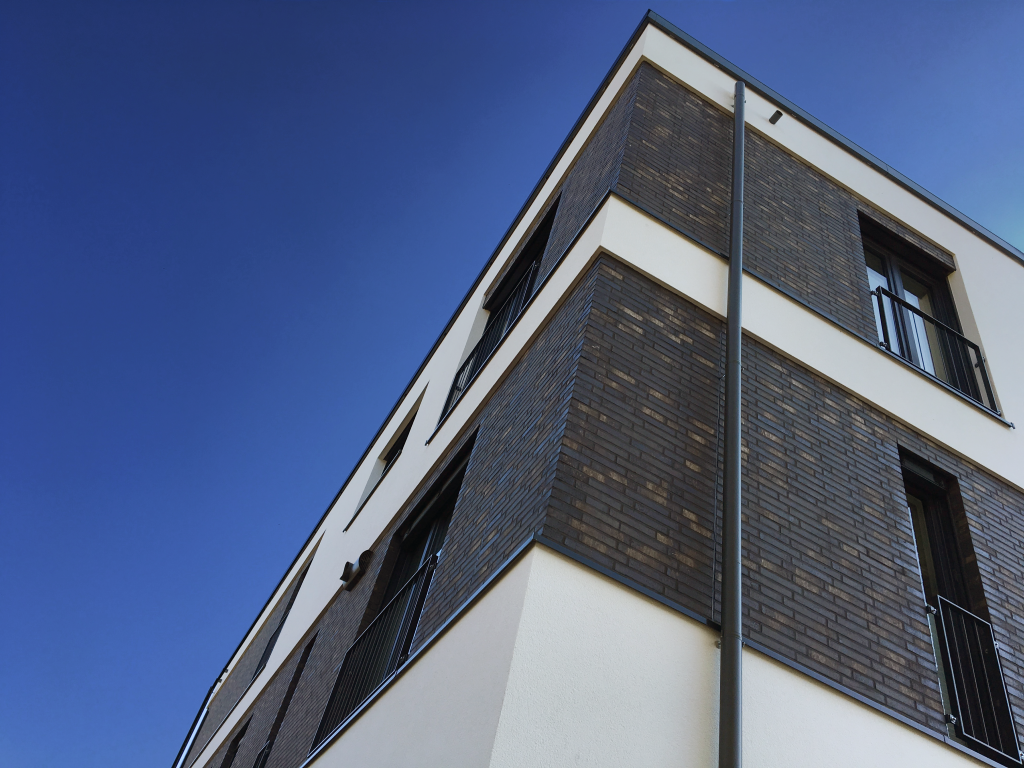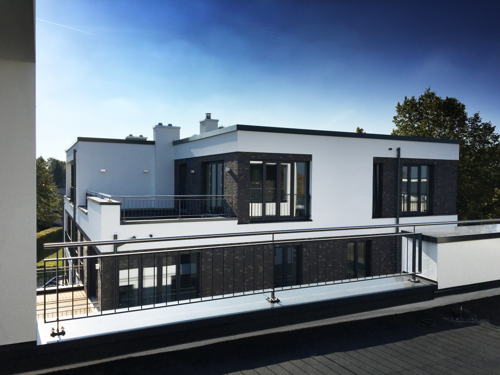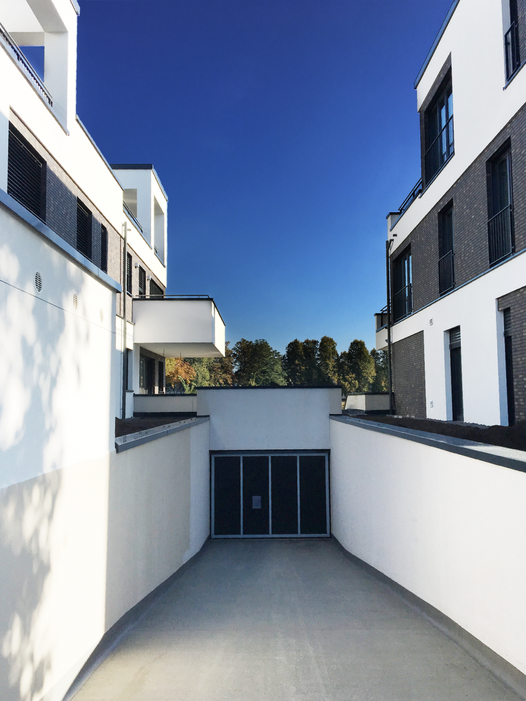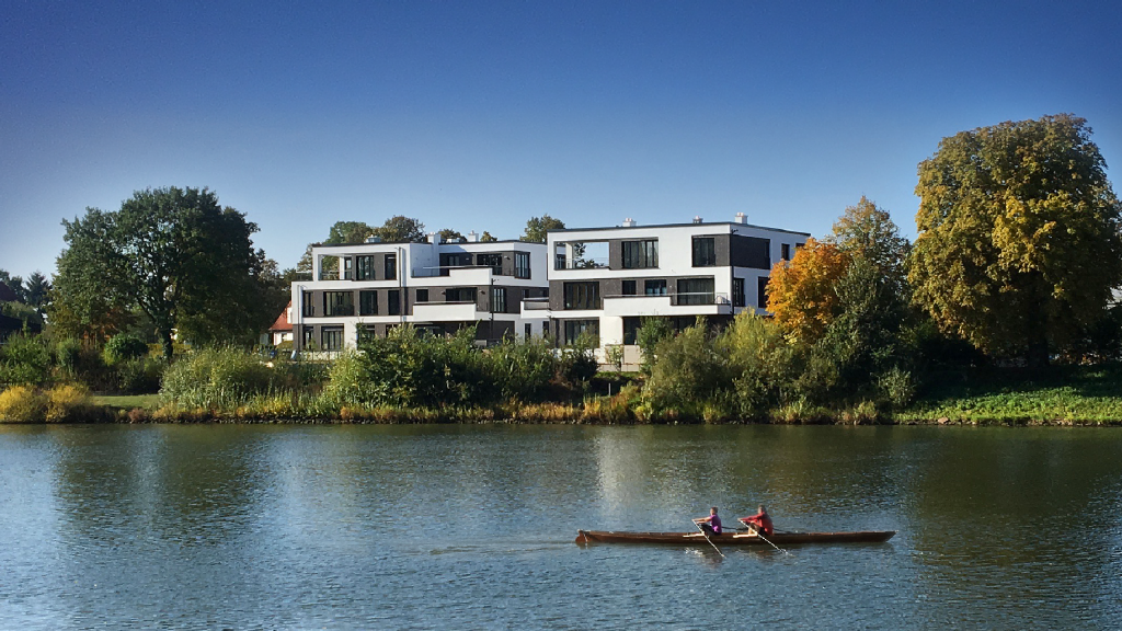 Die aufgelöste Blockstruktur mit zurückspringenden Terrassen und auskragenden Balkonen ermöglicht Privatsphäre trotz exponierter Lage mit einzigartigen Ausblicken , Kontraste von dunklem Verblender und hellem Putz schaffen eine spannungsvolle Fassade. Eine Holzpelletheizung, dezentrale Be- und Entlüftungsanlagen mit Wärmetauscher, barrierefreie Grundrisse sowie die bis zum extremsten Hochwassser dichte Tiefgarage sind weitere Merkmale des hochwertigen Wohnbaus. Durch die einzigartige Lage am Fluss ergeben sich einmalige Blickbezüge in die Umgebung