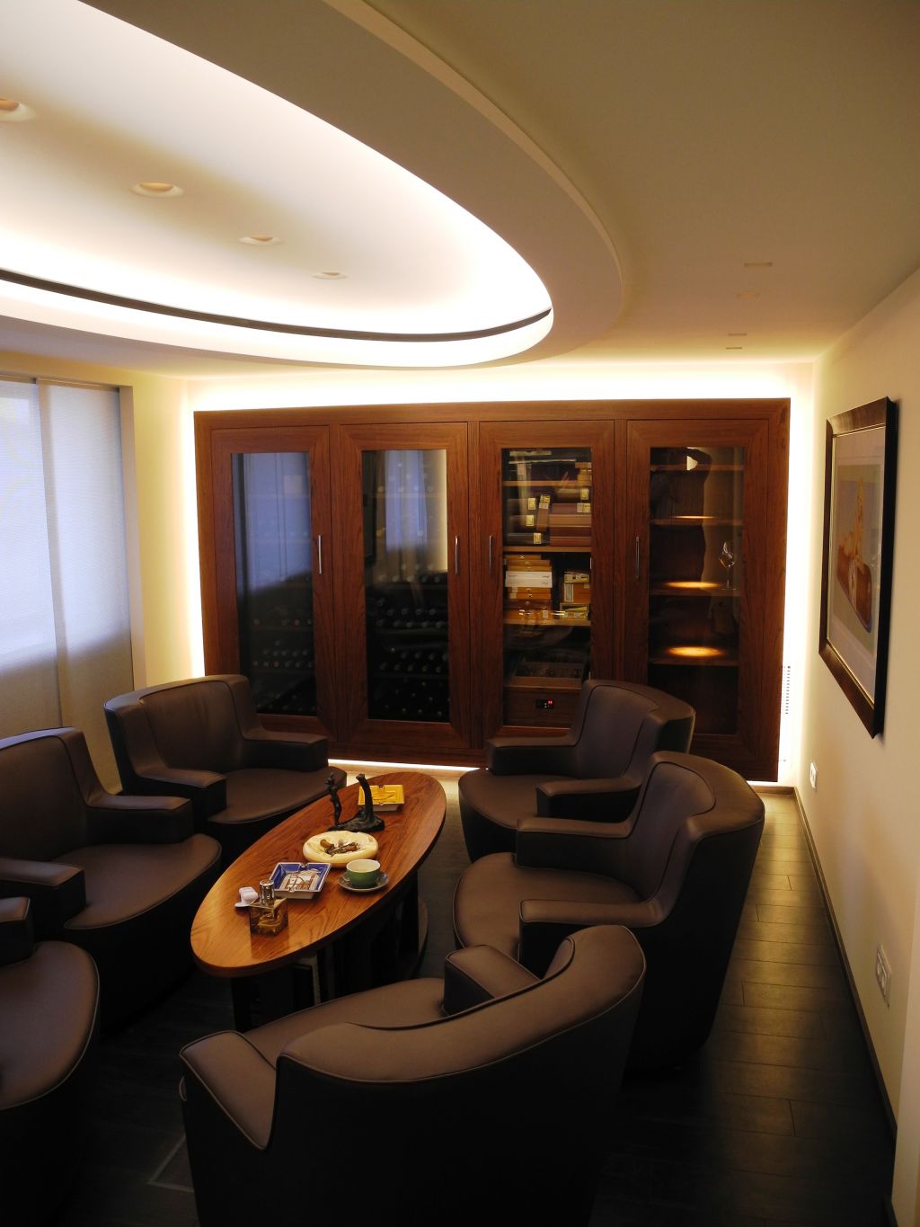 Entwurf und Innenausbau einer privaten Zigarrenlounge mit hinterleuchteten Einbaumöbeln für Humidor, Weinschränken etc., Einzelmöbeln, Decken"himmel" sowie zentraler Lüftungsanlage.
